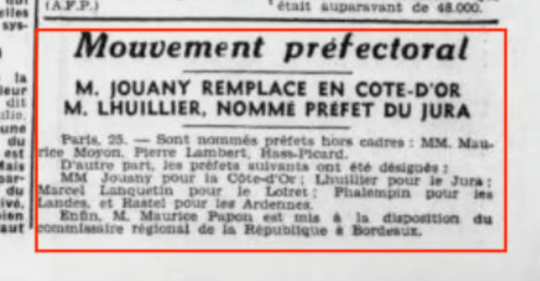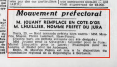 Le 26 octobre 1944, le journal La Bourgogne annonce, dans sa rubrique Mouvement préfectoral, la nomination de Marcel LANQUETIN comme préfet du Loiret (Orléans) et la mise à disposition de Maurice Papon ...